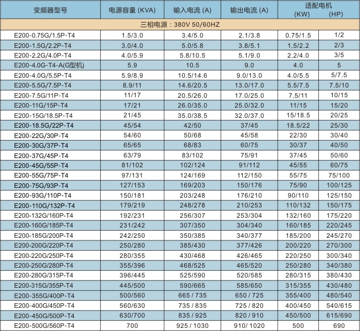E200系列通用型矢量變頻器-型號規(guī)格: